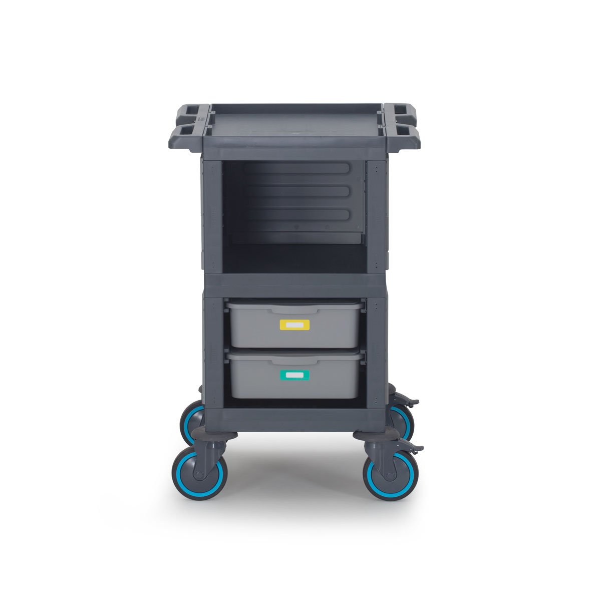 • WHEELS: 2 × Ø150 mm with brake, 2 × Ø150 mm without brake. All wheels: Plastic body, rubber surface, with bumpers