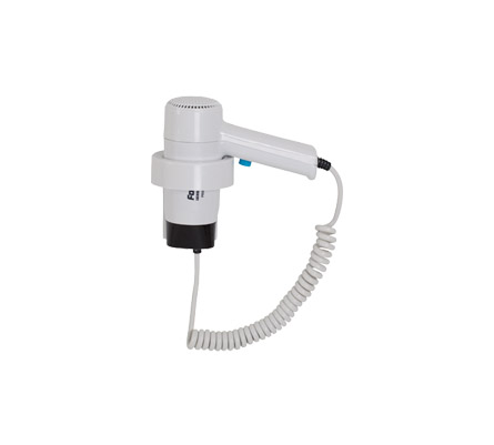 Hotel-type professional hair dryer. Preferred in bathrooms of hotels, hospitals, and dormitories to allow guests to dry their hair safely and hygienically. Its 1000W power, wall-mount capability, one-button operation, and automatic shut-off against overheating are key features.