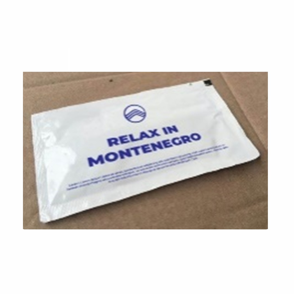 Wet wipes suitable for hospitality use. Available options include packaging with a single-color custom hotel logo or without any printing, depending on the selected option.